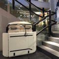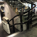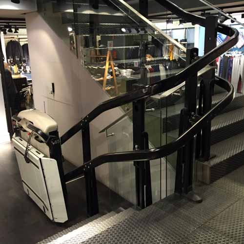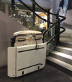 Este salvaescaleras recorre un tramo curvo de escalera, siguiendo el recorrido de la barandilla. Las barras de seguridad son automáticas en la bajada y la subida, en este caso, son retractiles para ocupar el mínimo espacio con la maquina esta en reposo. Cómodo panel de mando a bordo que acciona todas las funciones. La apertura de la plataforma y su cierre son motorizados .